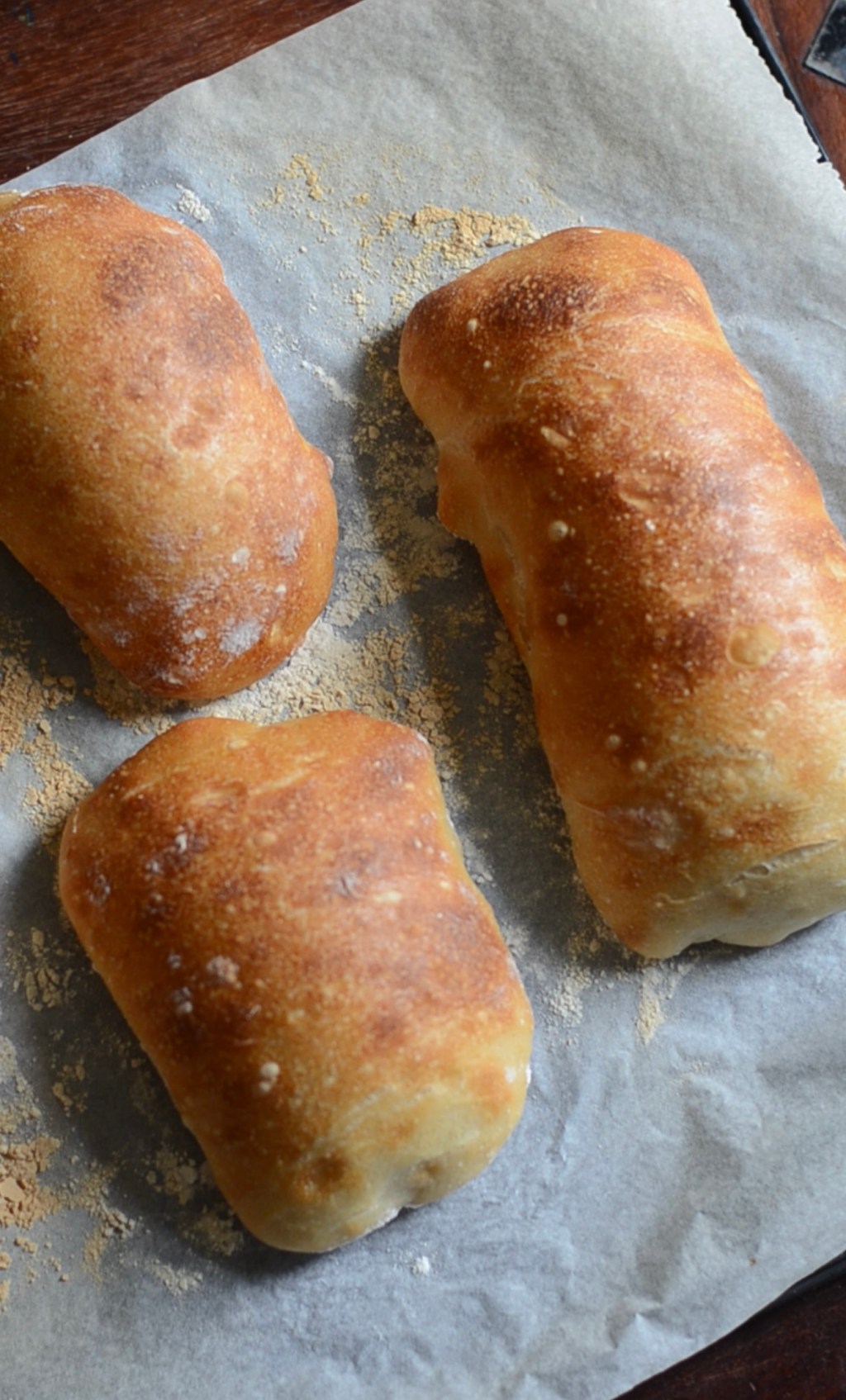 Roztáhněte si těsto do obdélníku o rozměru A3 a vykrojte z něj takové kusy, jaké budete chtít mít ciabatty. Lze třeba jen napůl a mít dva větší kusy chleba, nebo si udělejte míní ciabatty. Nechte ještě 20-30 minut odpočívat na pomoučeném pečícím papíru.