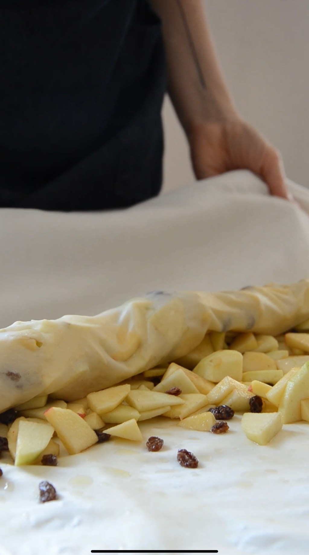Tradiční vídeňský štrůdl po vytažení ještě potřete rozpuštěným máslem, posypte strouhankou a posypte jablky smíchanými s cukrem, skořicí a rozinkami. Cukru dávám vždy od oka, záleží na sladkosti jablek, většinou jablka promíchám zhruba s hrstí cukru. Ráda dávám třtinový, jablka pak mají krásně karamelovou chuť a tmavou barvu. Náplň rozprostřete jen do poloviny těsta – je moc dobré, když se na vrchu štrůdlu setkají nakonec tři tenoučké křupavé vrstvy nad sebou.