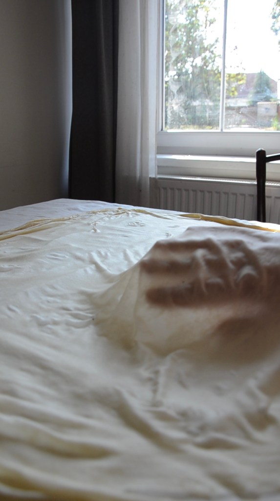 Ano, na těsto vám skutečně stačí jen mouka, voda, trochu tuku a trochu octa. Nic víc – žádné vejce, cukr, nebo kypřící prášek. Smíchejte všechny ingredience a důkladně ručně vypracujte heboučké a lesklé těsto konzistence modelíny. Přikryjte ho utěrkou a nechte klidně hodinu odpočívat. Potřebujete, aby se lepek v těstě rozvinul a dovolil vám pak těsto vytáhnout do obdivuhodných rozměrů.